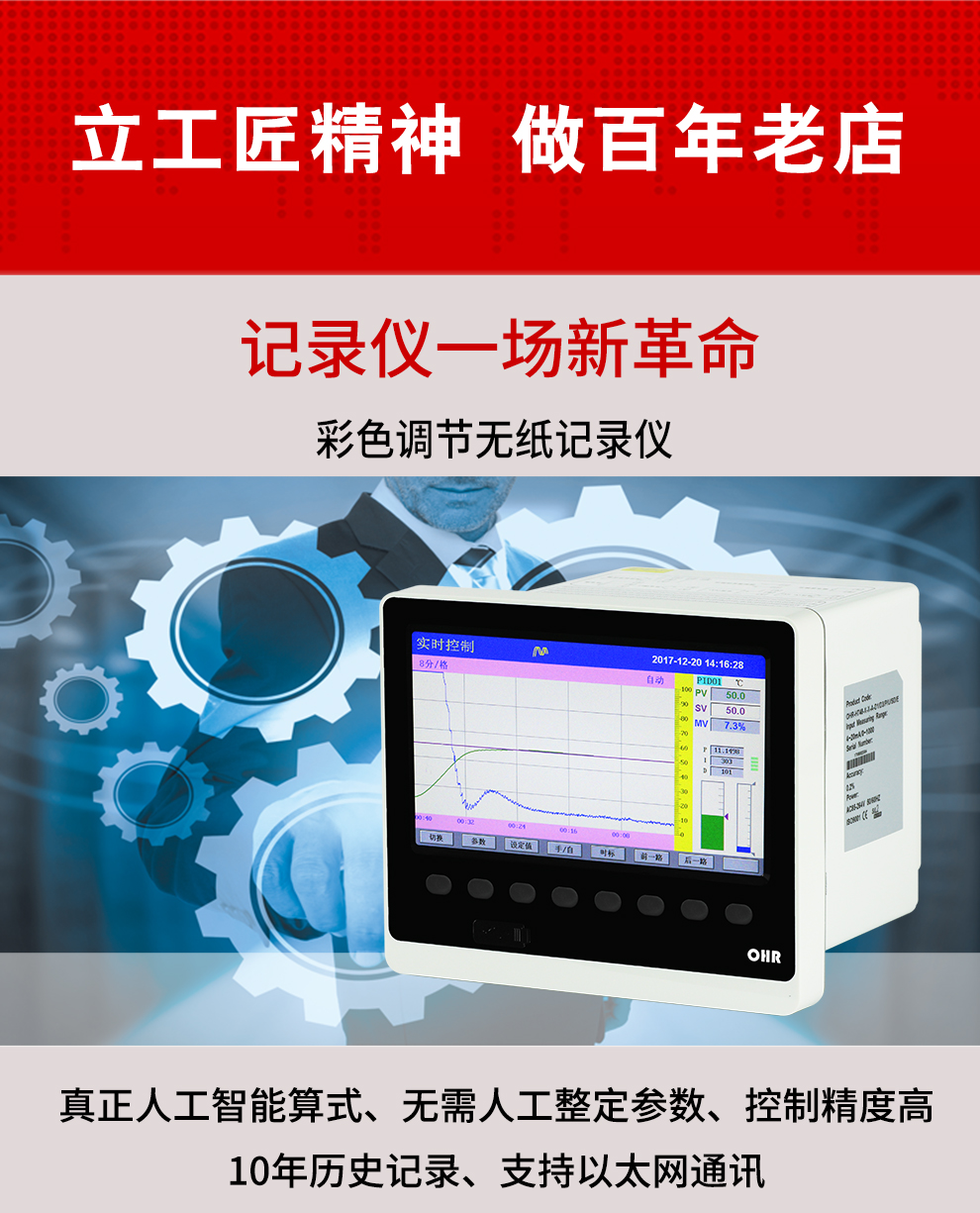 OHR-H300系列彩色調(diào)節(jié)無紙記錄儀采用真正的人工智能算式,儀表啟動自整定功能,可根據(jù)被控對象的特性,自動尋找最優(yōu)參數(shù)以達(dá)到很好的控制效果,無需人工整定參數(shù)。控溫精度基本達(dá)±0.1℃,無超調(diào)、欠調(diào),達(dá)國際先進(jìn)水平。24路萬能輸入(可組態(tài)選擇輸入:標(biāo)準(zhǔn)電壓、標(biāo)準(zhǔn)電流、熱電偶、熱電阻、毫伏等)其中可帶8路控制輸入。