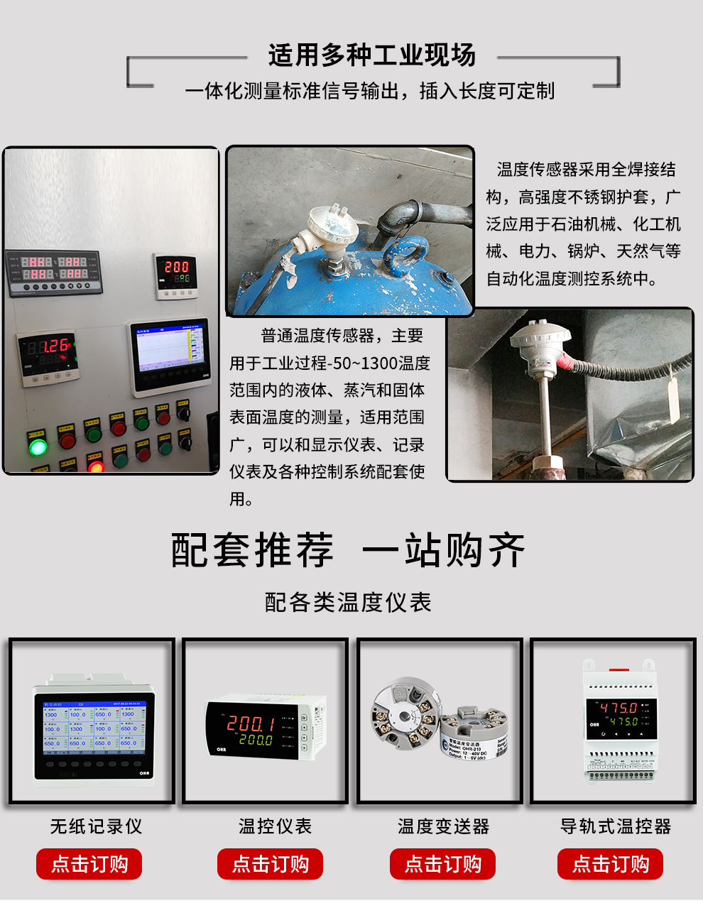 裝配式熱電阻熱電偶作為溫度測(cè)量傳感器,通常與溫度變送器、調(diào)節(jié)器及顯示儀表等配套使用,組成過(guò)程控制系統(tǒng),用以直接測(cè)量或控制各種生產(chǎn)過(guò)程中流體、蒸汽和氣體介質(zhì)以及固體表面等溫度。